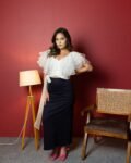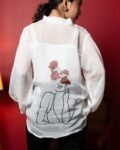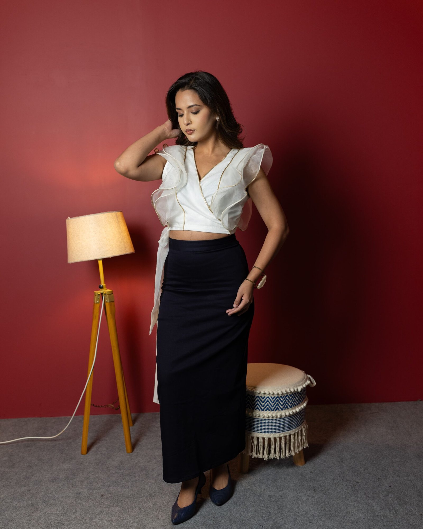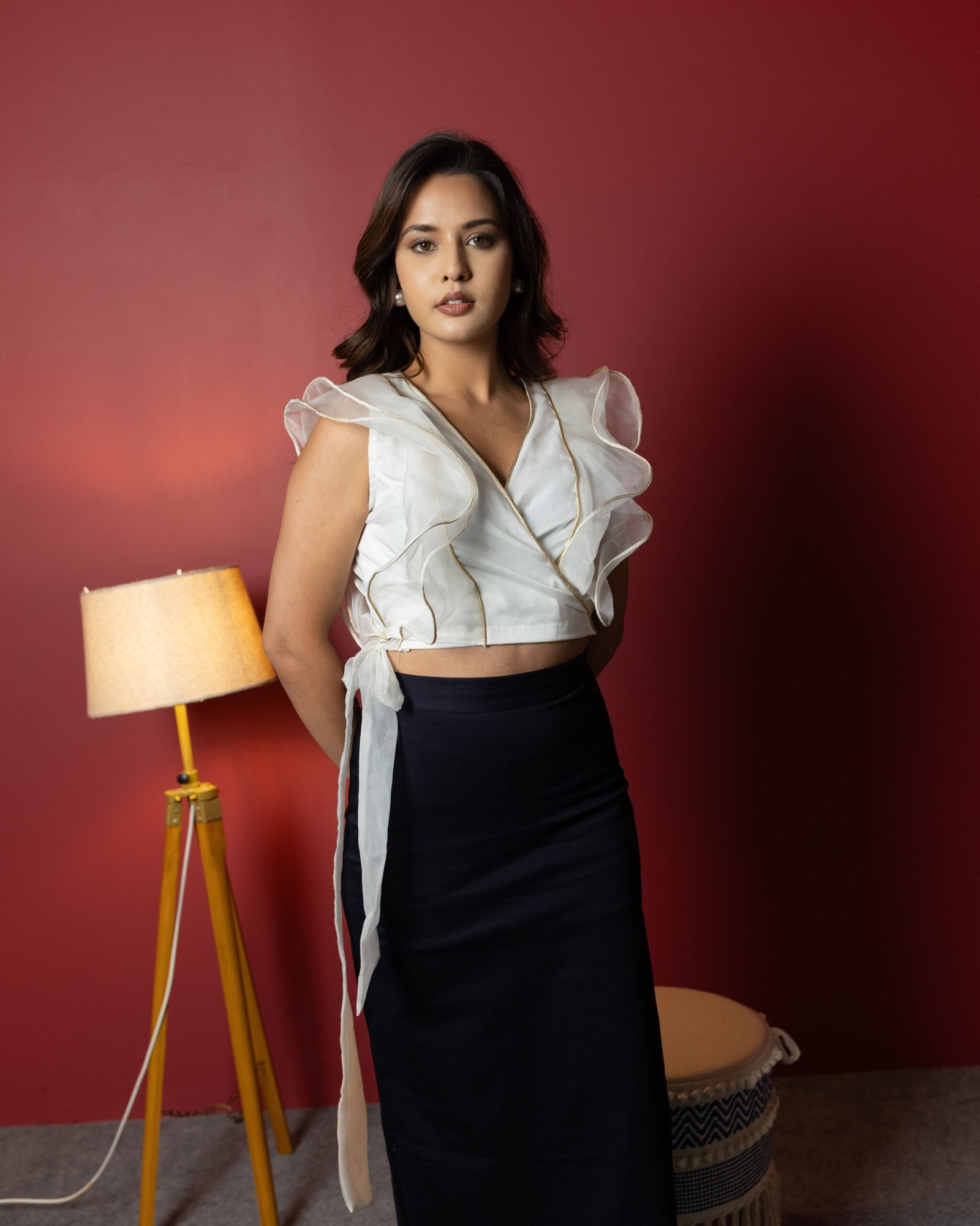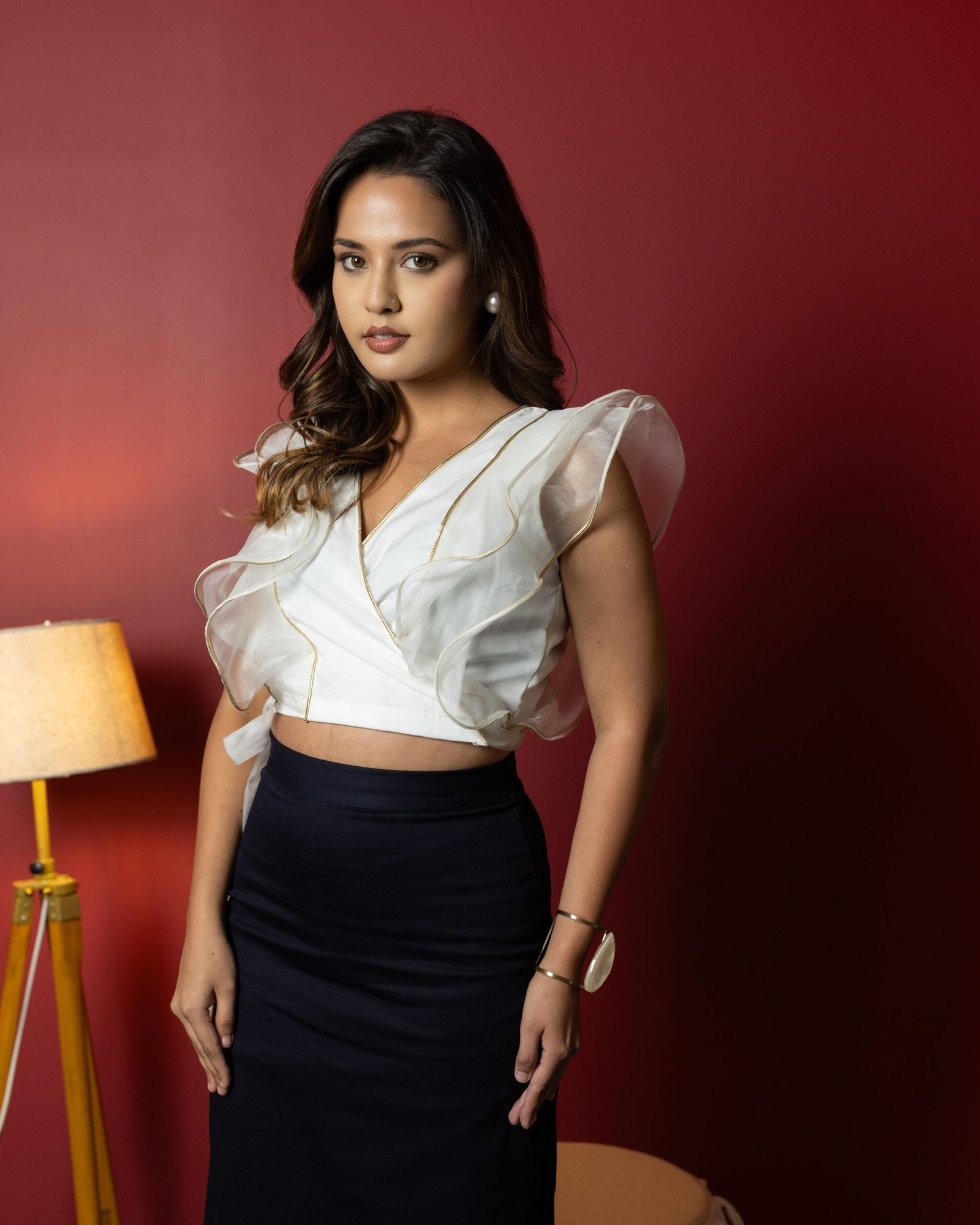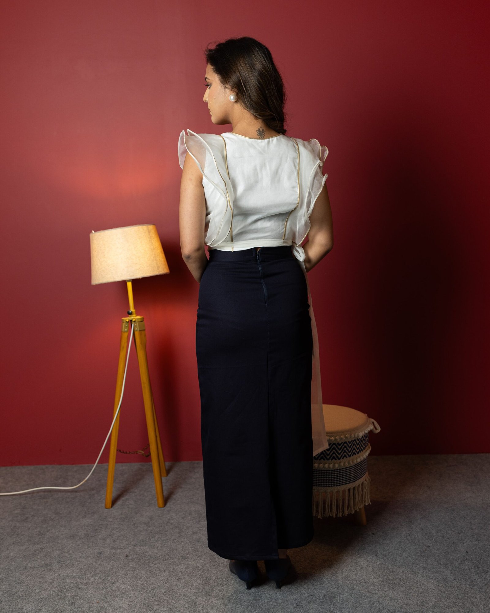 Make an unforgettable impression in this ethereal white organza wrap top, where femininity meets finesse. Crafted with exquisite attention to detail, the top features golden leather piping that adds a subtle shimmer and a hint of edge. The ruffled accents flow with every step, while the tie-up waist sculpts your silhouette just the way you like. Whether you’re dressing up for a brunch date or styling it for a night out, this top is a perfect blend of soft romance and modern confidence.