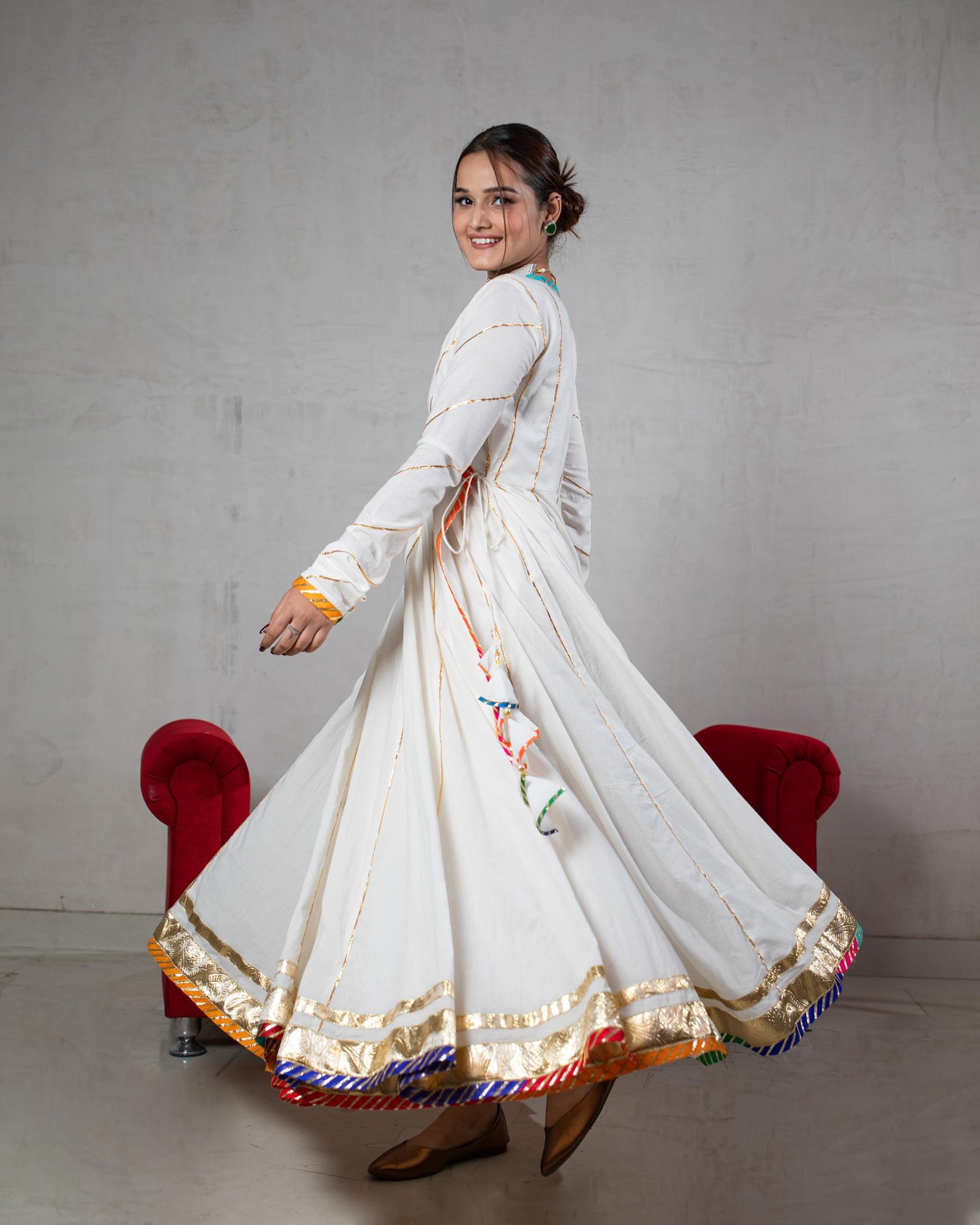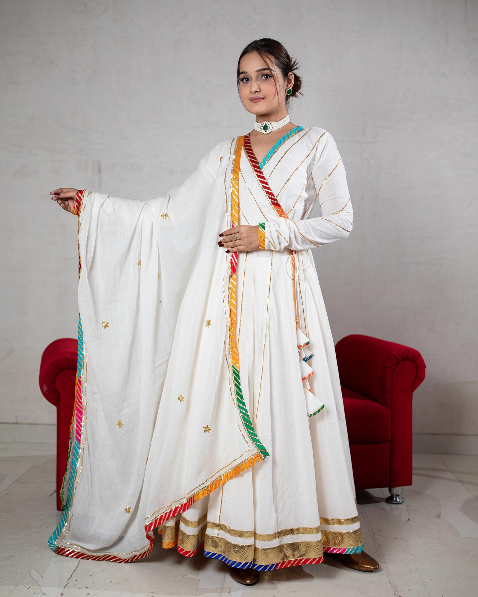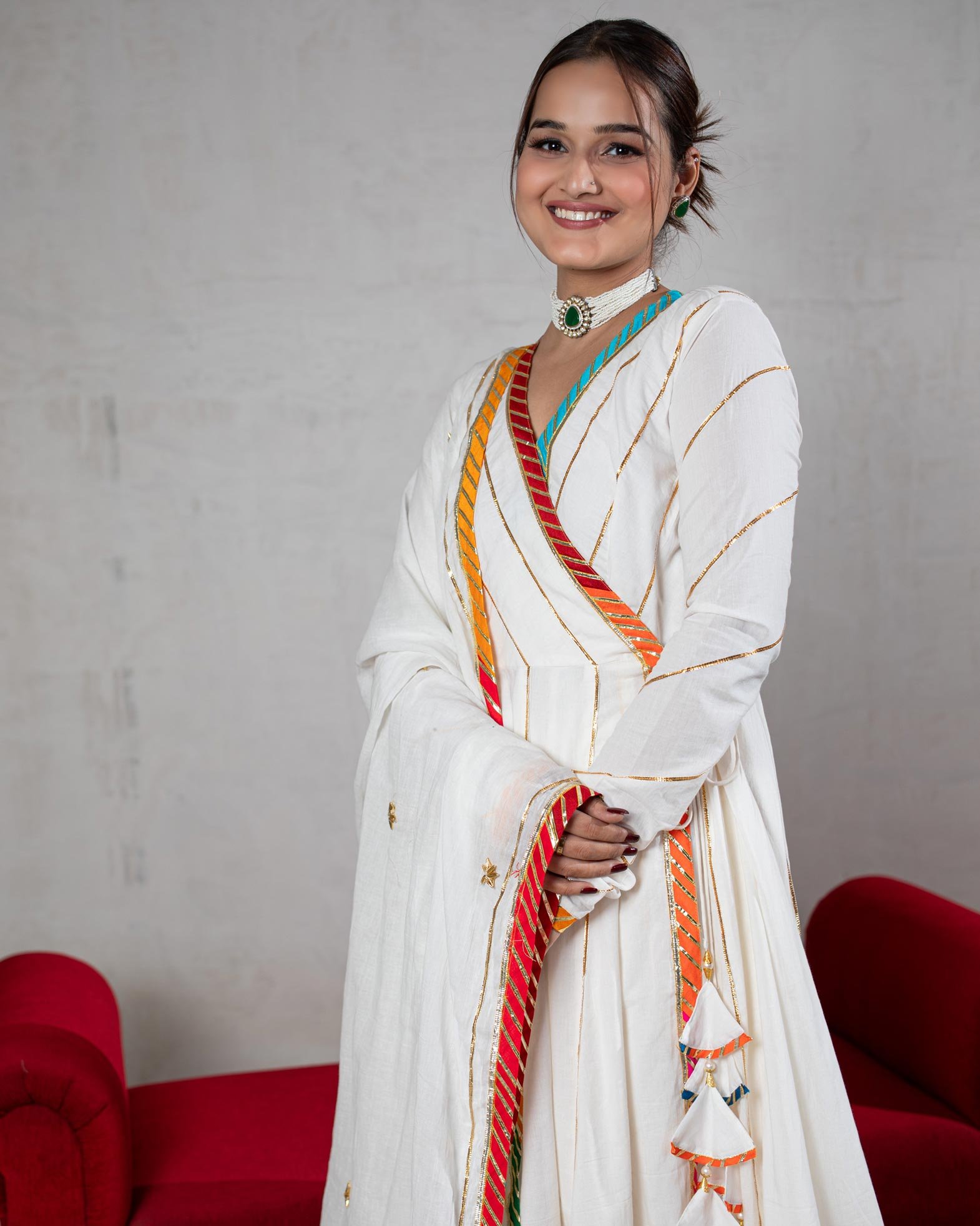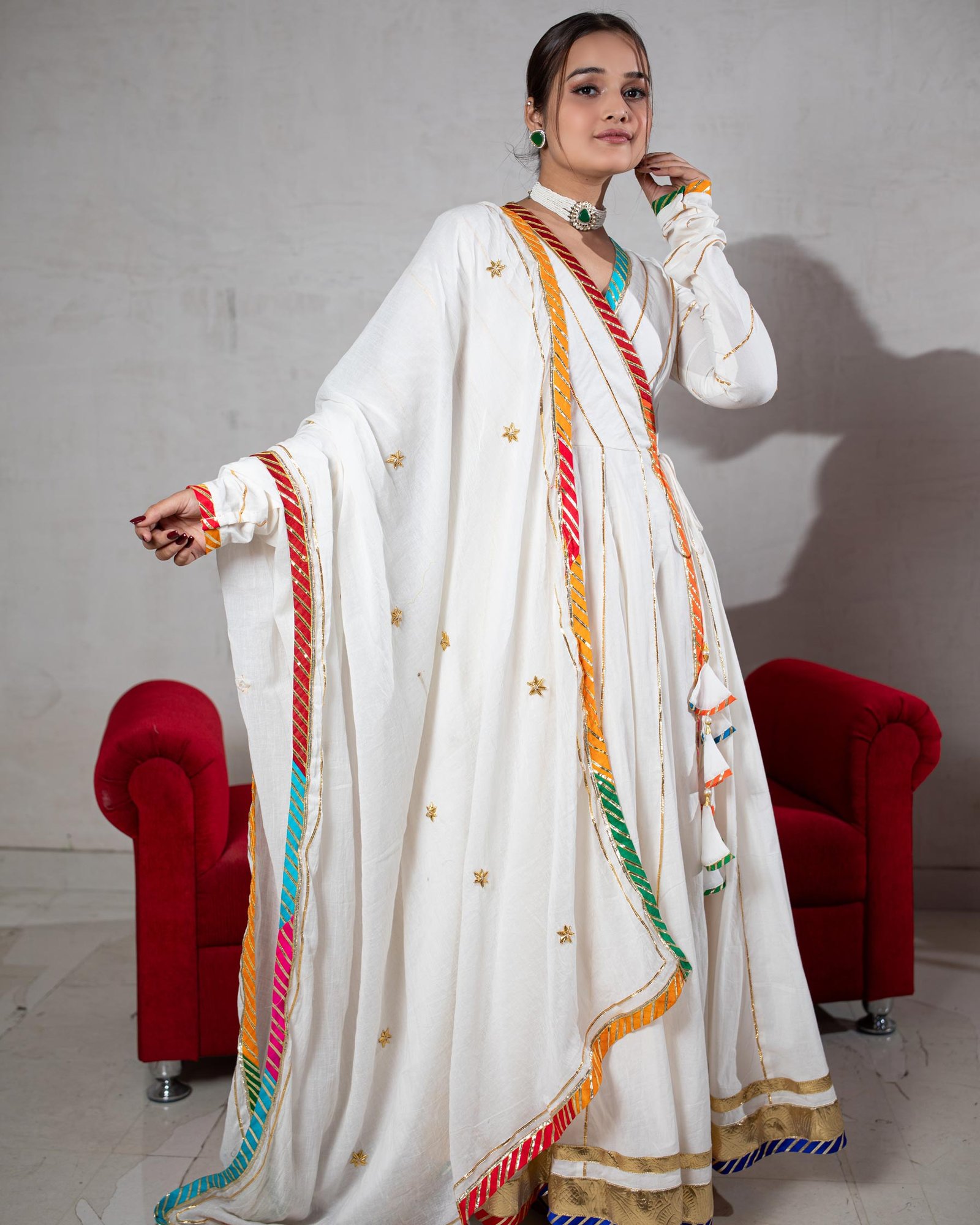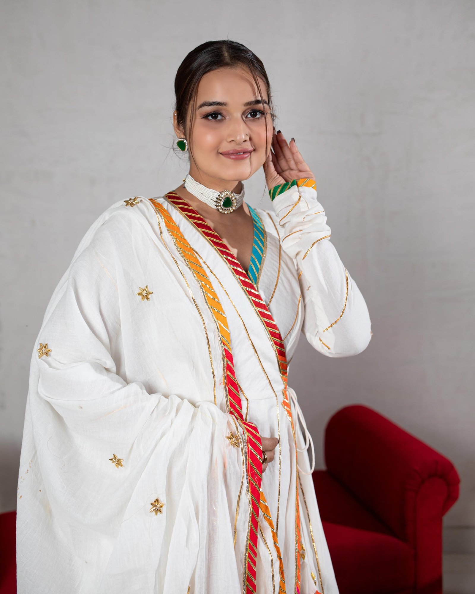 Off White long sleeve Angrakha with colored mungji lace work, hand made tussels, hand made mulmul dupatta and cotton pant.