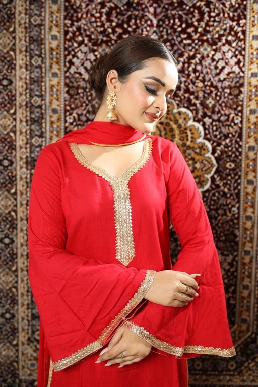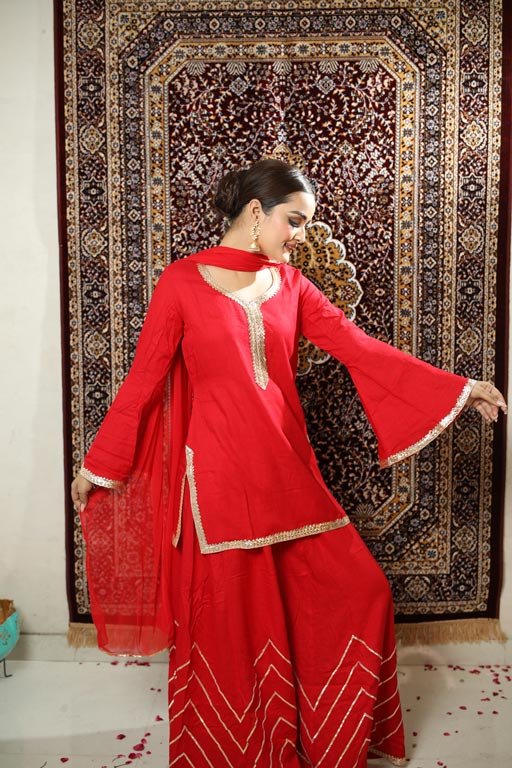 Red Rayon Slub Palazzo Suit with Chiffon Dupatta