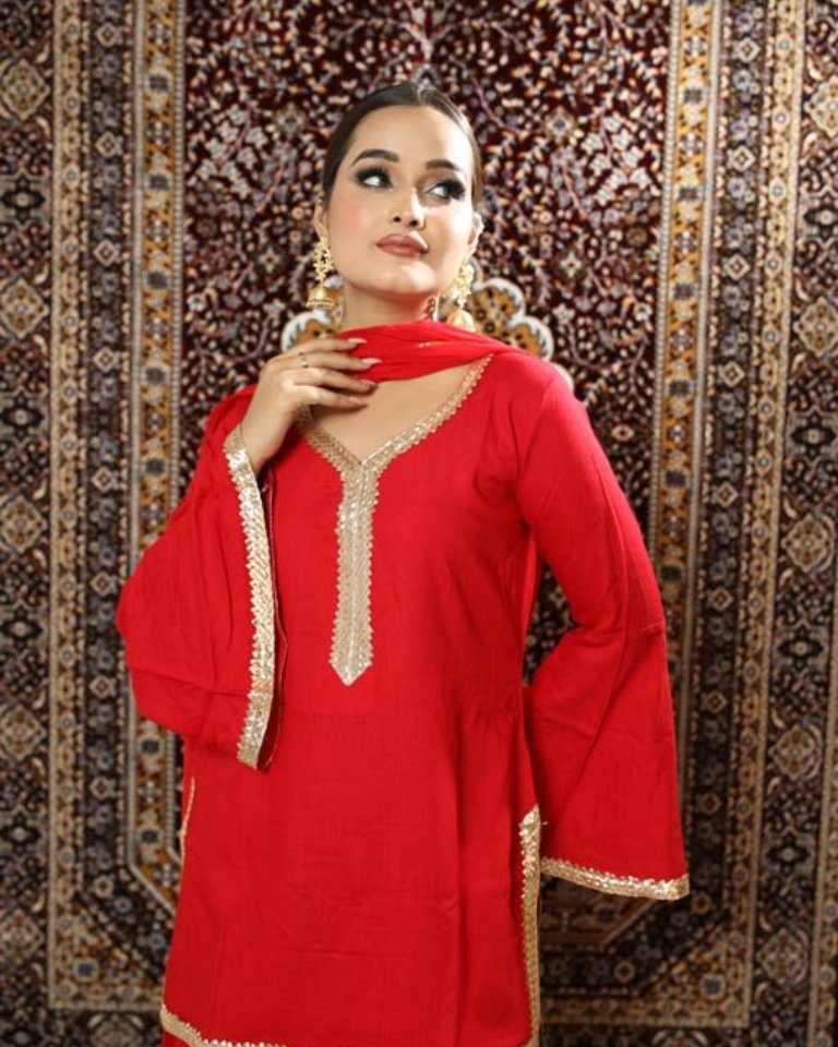 Suit with flared palazzo and chiffon dupatta, kurti with round V neck, long bell sleeve, designed with chattai gota & flared palazzo with charkhi gota on it.