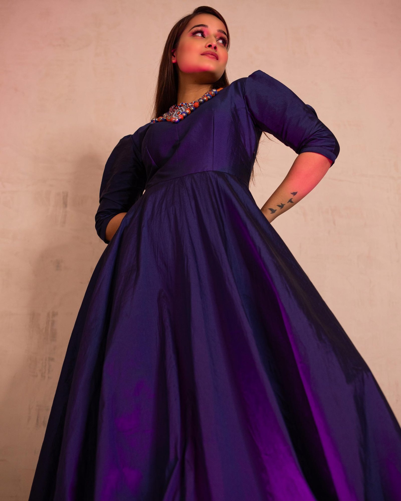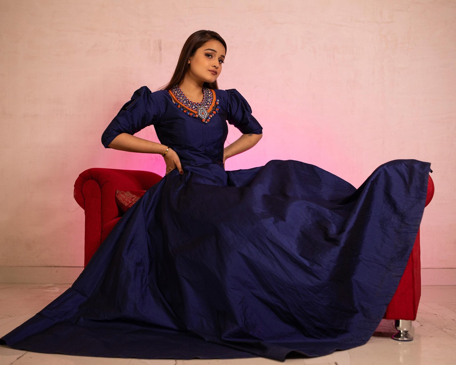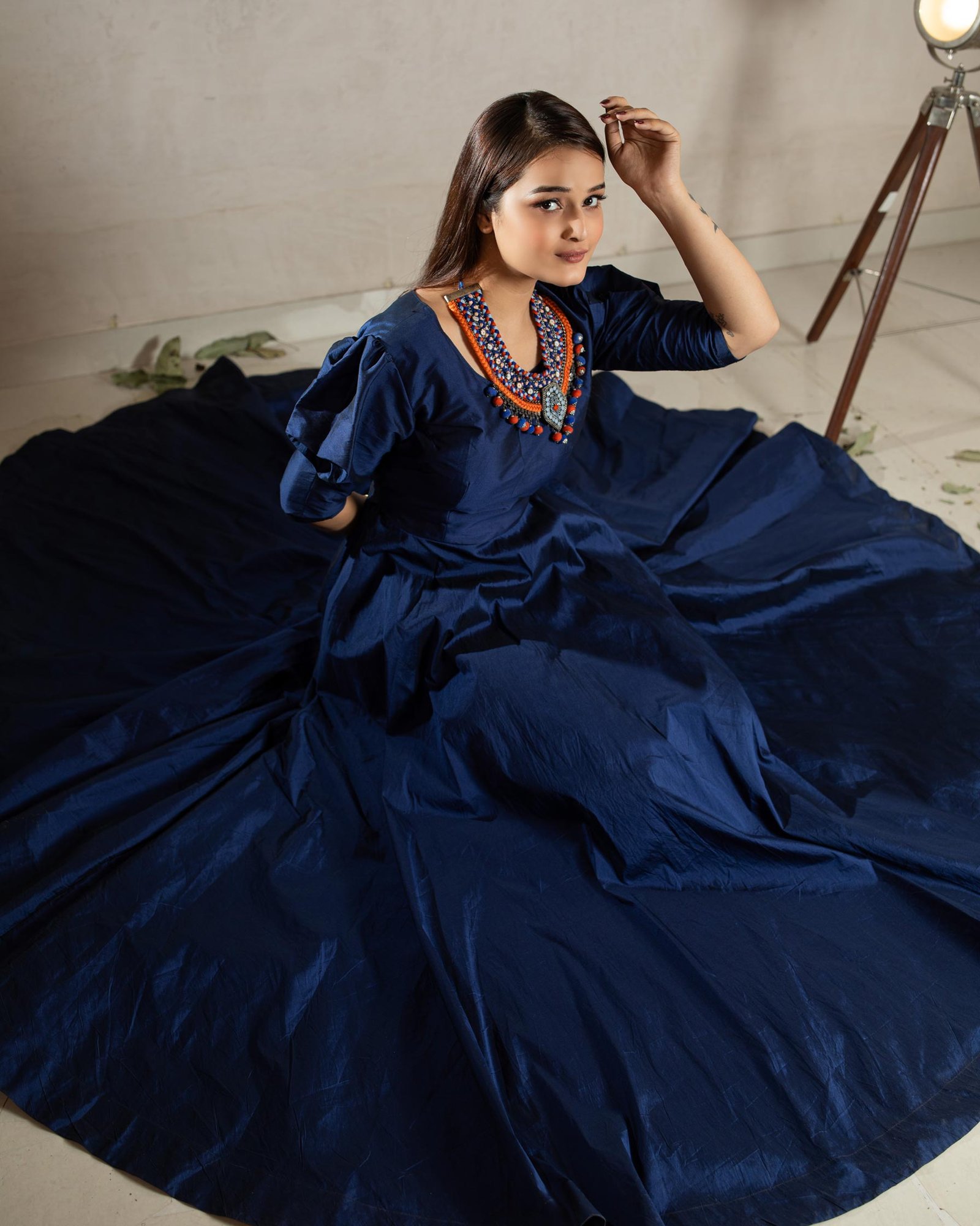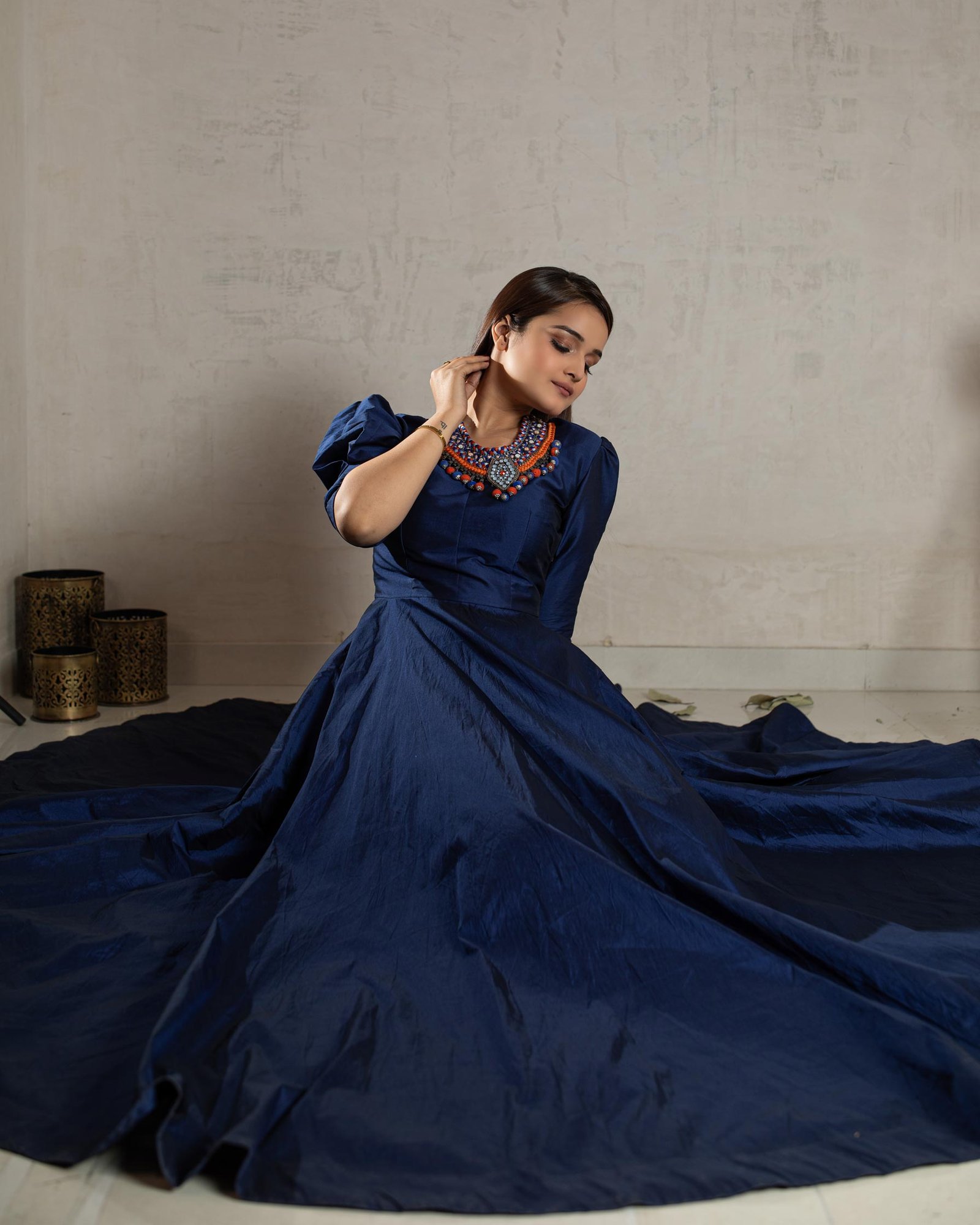 Taffeta Silk Navy Blue Full Flare Gown with short puff sleeve, Detachable neck piece and with cotton lining.